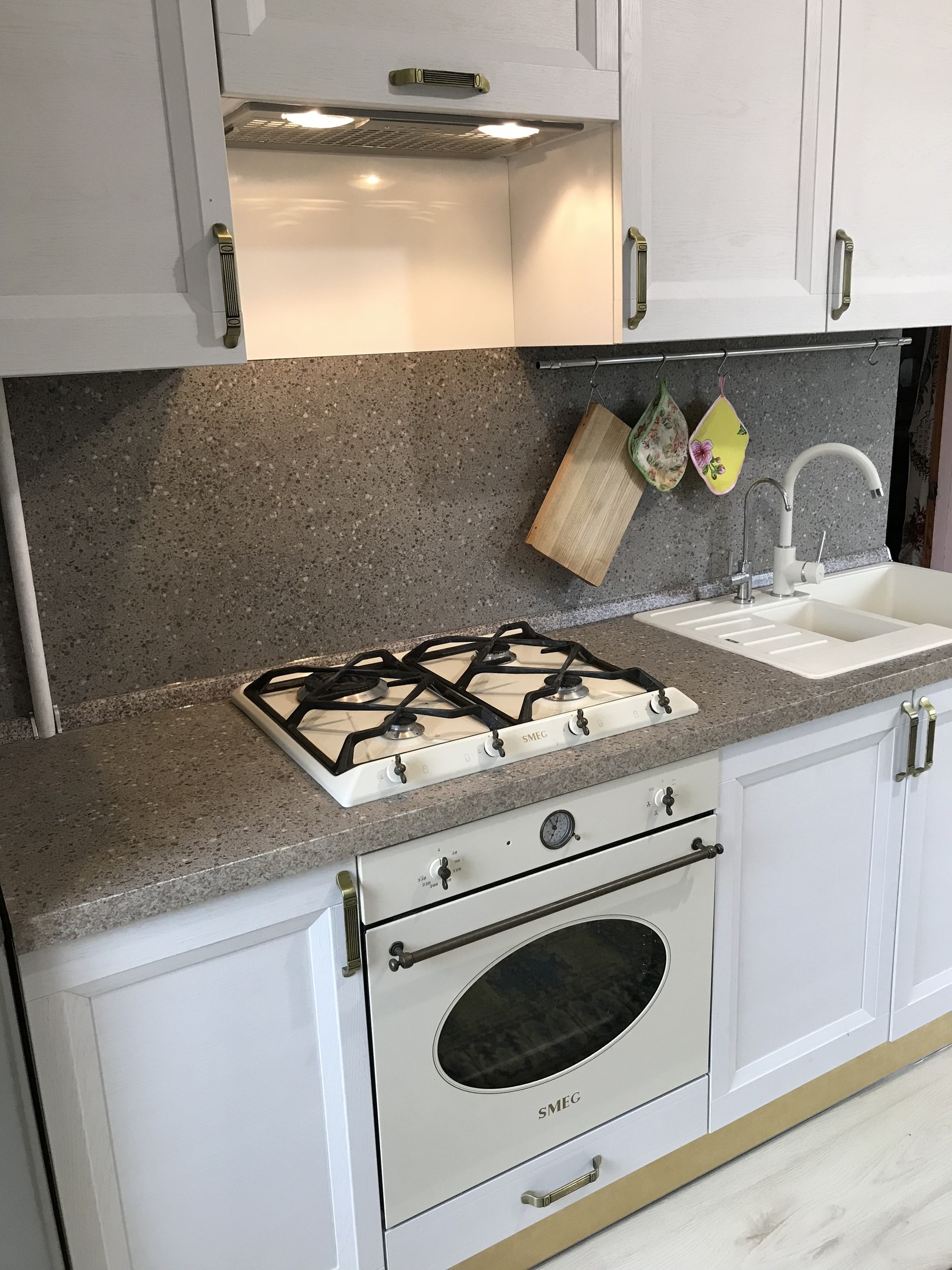 Низ: Три ящика, мойка нерж. со смесителем, 2-х комфорочная керамическая варочная поверхность "KUPPERSBERG", ящик с лотком для столовых приборов, ящик с полочками.