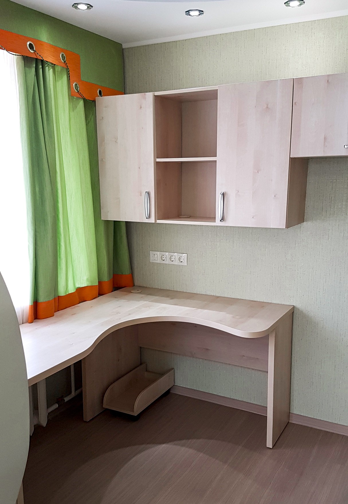 Верх: Три ящика, сушка для посуды нерж., ящик с 2-мя полочками, ящик под встроенную вытяжку со встроенной вытяжкой.